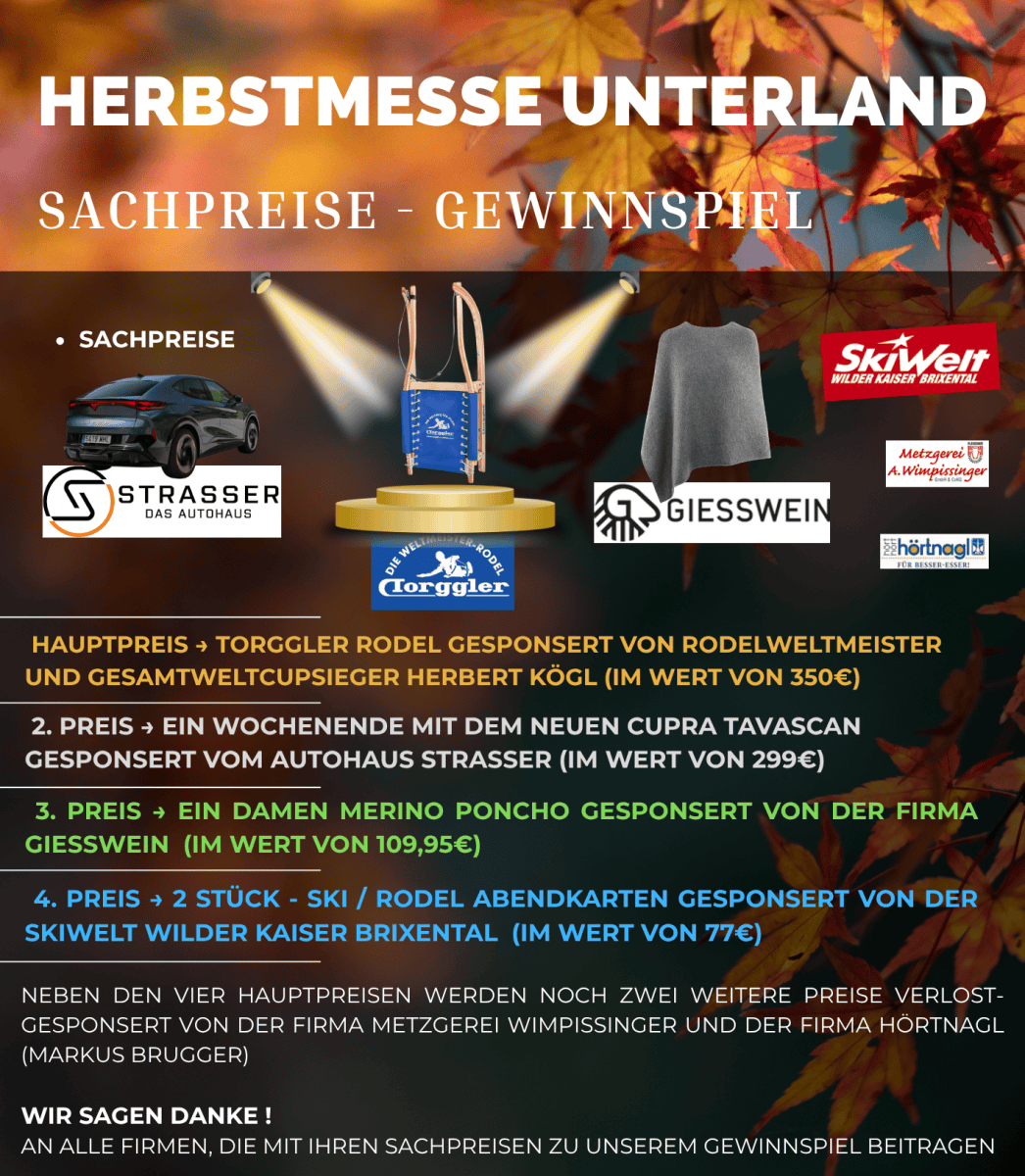 Ein Highlight der Herbstmesse Unterland ist das Gewinnspiel mit tollen Sachpreisen – die Ziehung findet am Sonntag, direkt vor Ort statt (Teilnahme exklusiv für Messebesucher).